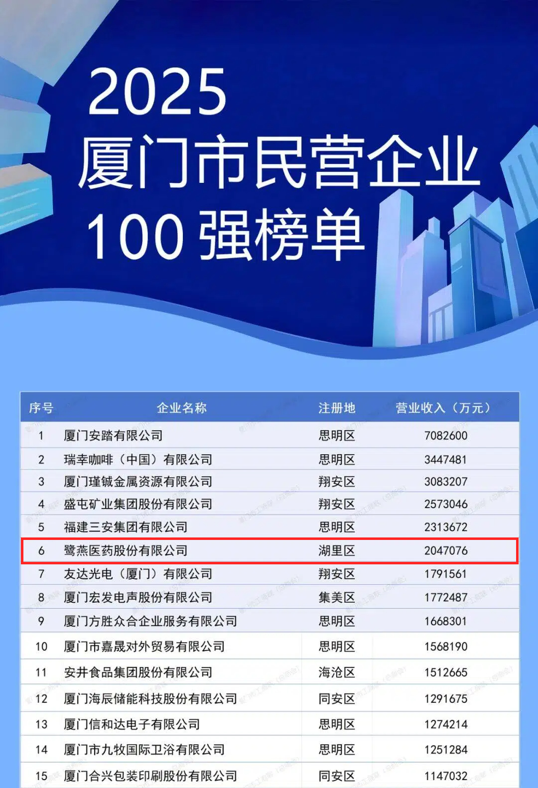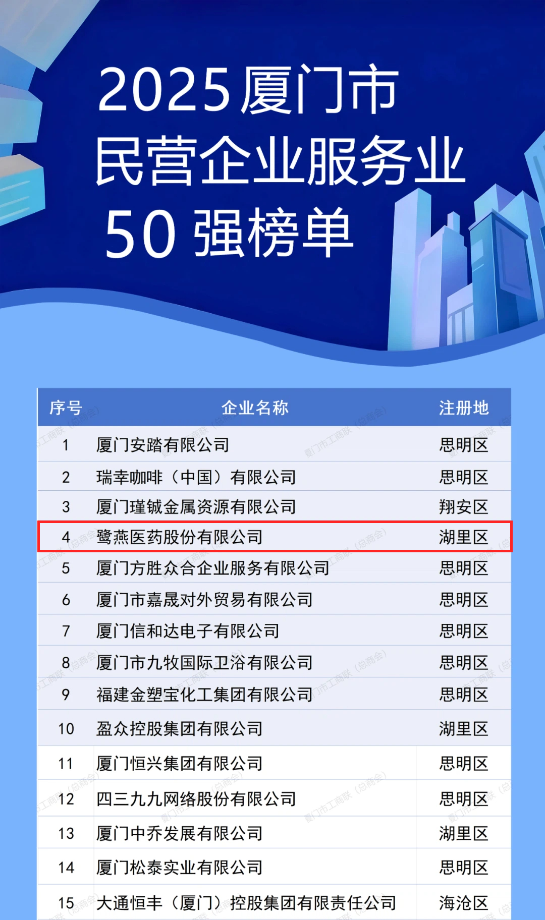 11月1日上午,2025年廈門企業(yè)家日大會召開。大會發(fā)布了2025廈門市民營企業(yè)100強系列榜單,介紹了廈門市民營經(jīng)濟發(fā)展態(tài)勢和營商環(huán)境建設(shè)成效。鷺燕醫(yī)藥股份有限公司憑借上市企業(yè)綜合實力,榮膺“2025廈門市民營企業(yè)100強”第6位,以及“2025廈門市民營企業(yè)服務(wù)業(yè)50強”第4位。